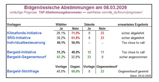 Hier unsere aktuellen, wenn auch nur vorläufigen Prognosen zum Abstimmungsausgang: