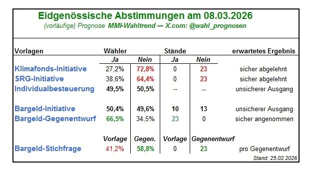 "In der Schweiz finden am 08.03.2026 mehrere Eidgenössische Volksabstimmungen statt. Konkret soll das Wahlvolk abstimmen über folgende Vorlagen: die SRG-Initiative, die Klimafonds-Initiative, das Bundesgesetz zur Individualbesteuerung sowie die Bargeld-Initiative und deren direkter Gegenentwurf. Bzgl. der Bargeld-Initiative findet zudem eine Stichfrage statt, falls beide Vorlagen angenommen werden sollten. - Kannst du mir konkret benennen, wie viele Ja-Stimmen in Prozent die einzelnen Abstimmungen vermutlich erhalten werden und wie die bereits genannte Stichfrage in Prozenten ausgehen könnte? Mir ist dabei wichtig, konkrete Prozentzahlen zu erhalten. - Berücksichtige bei deiner Analyse bitte nicht alleine die Umfrageinstitute (gfs Bern, Leewas, YouGov), sondern auch weitere Prognosen und Einschätzungen alternativer Anbieter und Institute - z.B. Wahlfieber (incl. Wahlfieber Average, Wahlfieber Wahlbörsen, Wahlfieber Team), 50plus1, XPoll21 – Umfragen auf X, Sebastien Perseguers, Gradiom.ch, MMI-Wahltrend, ThP-Abstimmungsbarometer, foeg-Abstimmungsmonitor, Matthias Bürcher, CH-Polit-X sowie weitere Prognostiker."