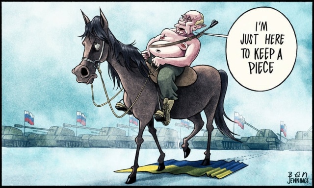 Und Putinfreund Trump, der Putins "Schachzug" genial nennt und lobt, hat auch seinen Anteil am Krieg, indem er vier Jahre lang die USA und die NATO geschwächt hat und maßgeblich am US-Verrat an Kurden und Afghanen Schuld ist. Das ermuntert dann auch Kiegstreiber aller Art.